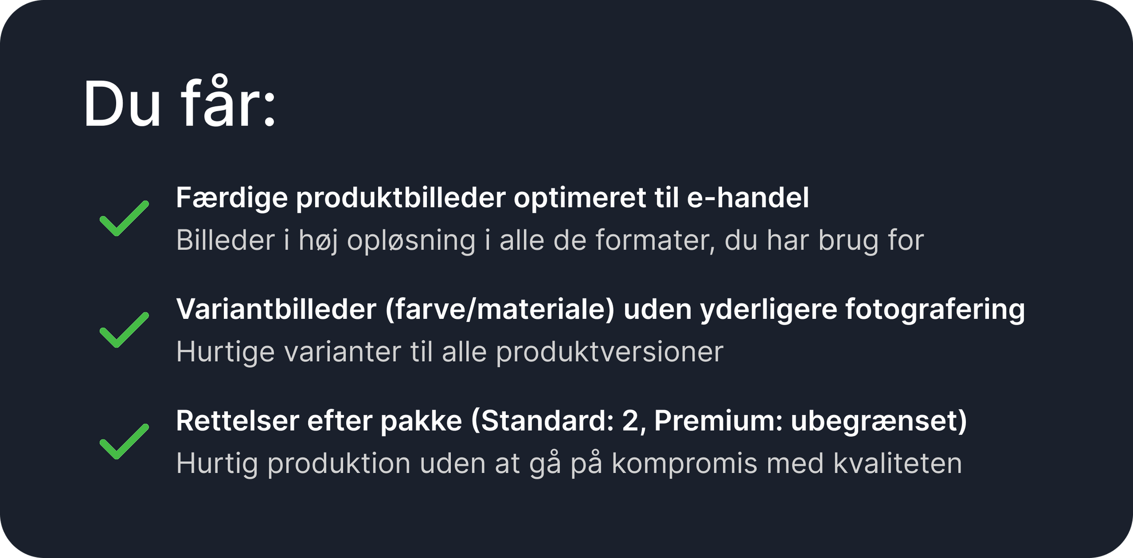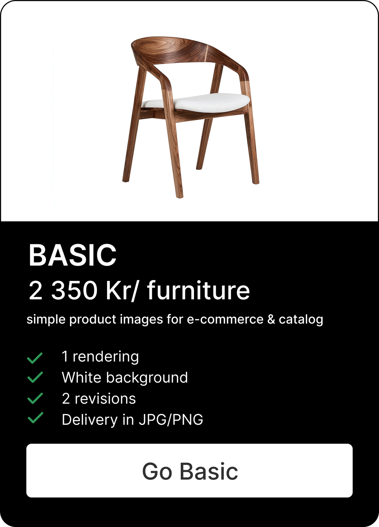 Vi tilbyder 3D-gengivelser i høj kvalitet, der fremhæver dine produkter på den bedste måde – uanset om du har brug for simple billeder til e-handel eller eksklusive præsentationer til markedsføring. Vælg den pakke, der passer til dine behov: