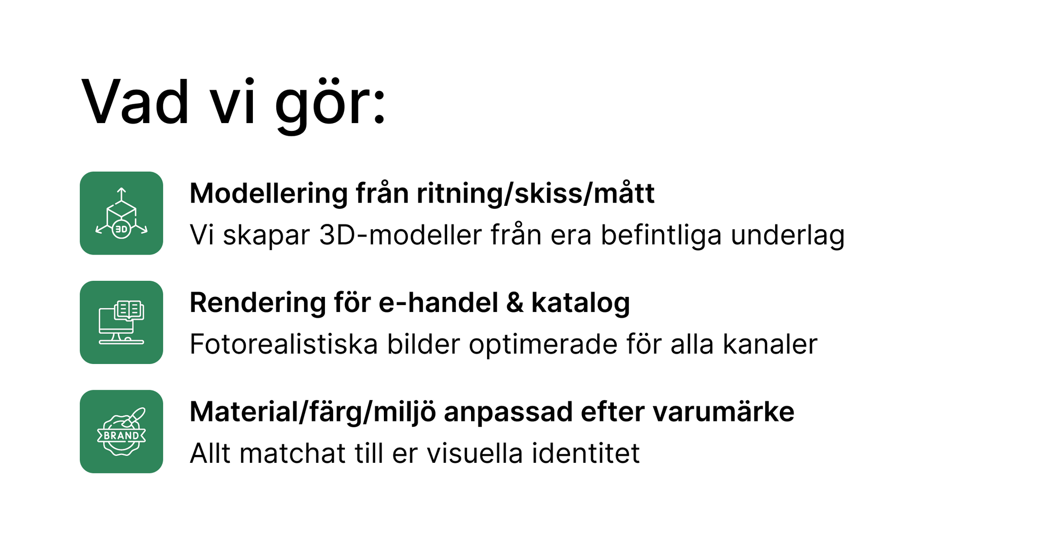 Vi hjälper er både när ni saknar 3D-underlag och när ni redan har modeller klara. Ni får färdiga, konsekventa produktbilder som går att återanvända i e-handel, katalog och kampanjer.