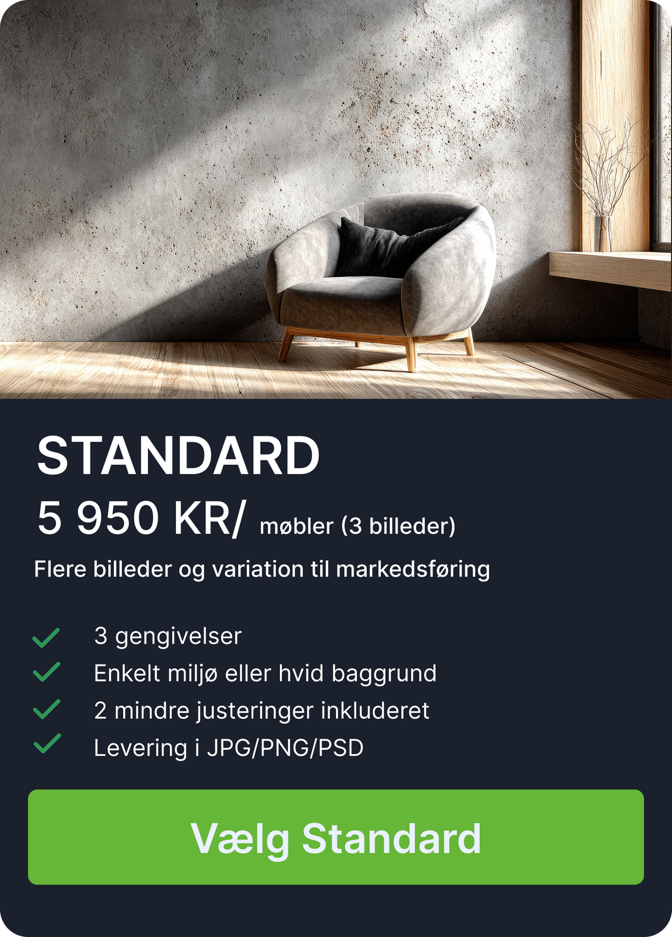 Vi tilbyder 3D-gengivelser i høj kvalitet, der fremhæver dine produkter på den bedste måde – uanset om du har brug for simple billeder til e-handel eller eksklusive præsentationer til markedsføring. Vælg den pakke, der passer til dine behov:
