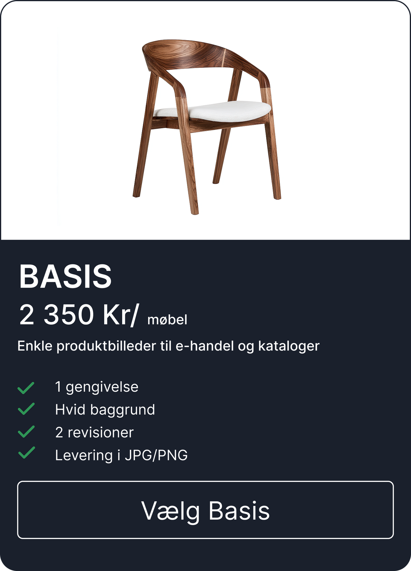Vi tager dine møbler fra skitse, mål eller CAD-fil til fotorealistiske billeder – klar til e-handel, katalog og kampagne, så du kan lancere hurtigere uden traditionelle produktfotos.