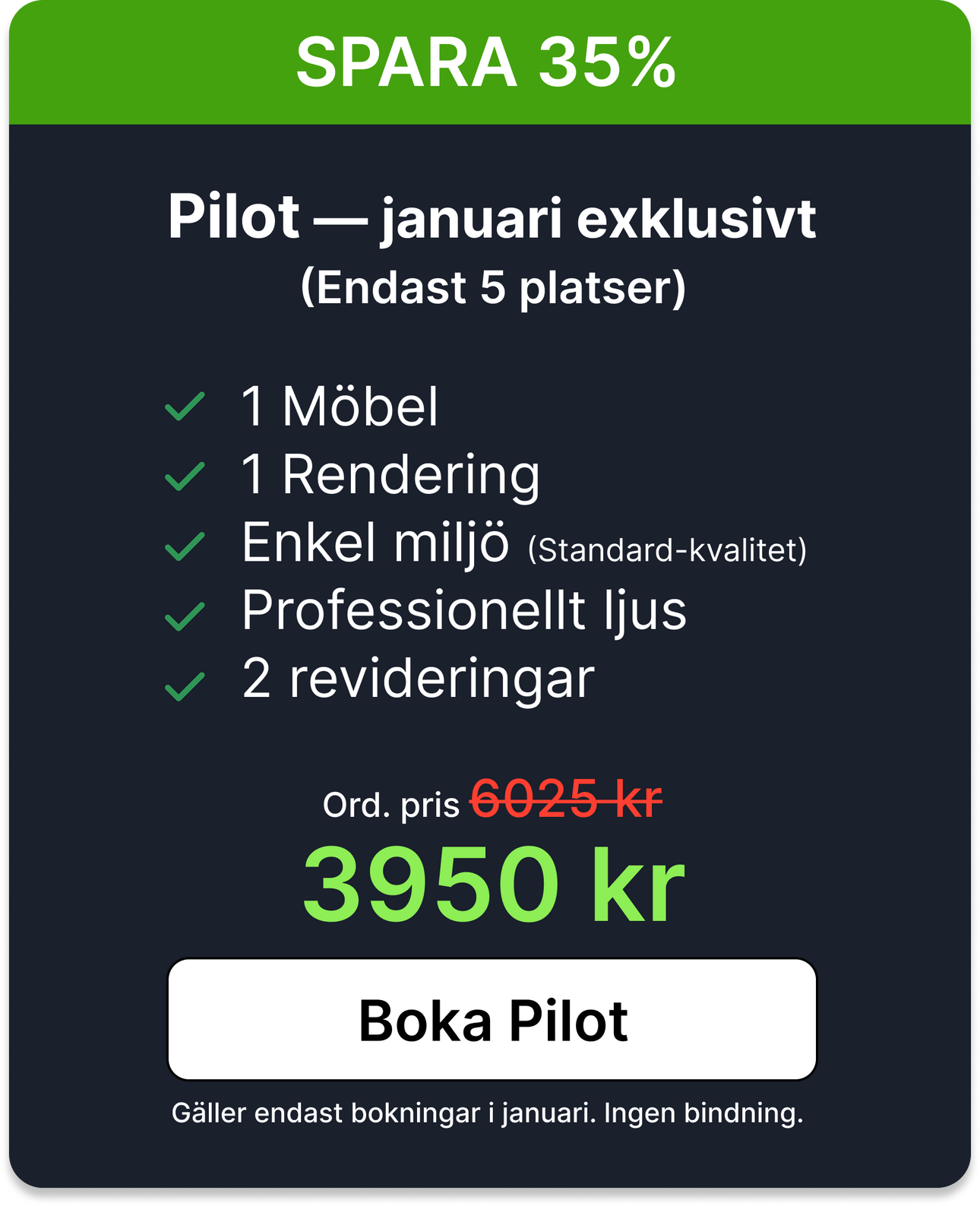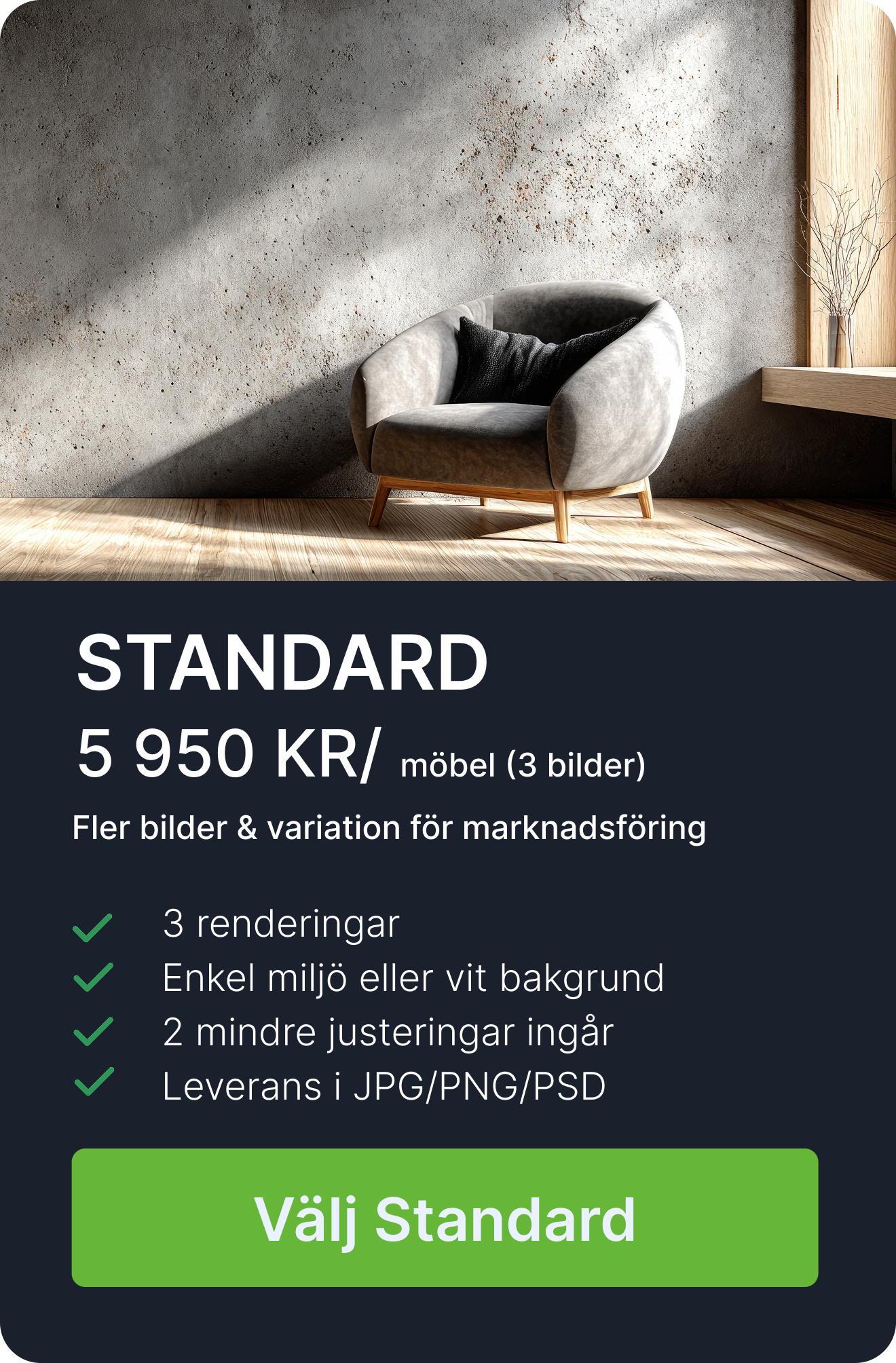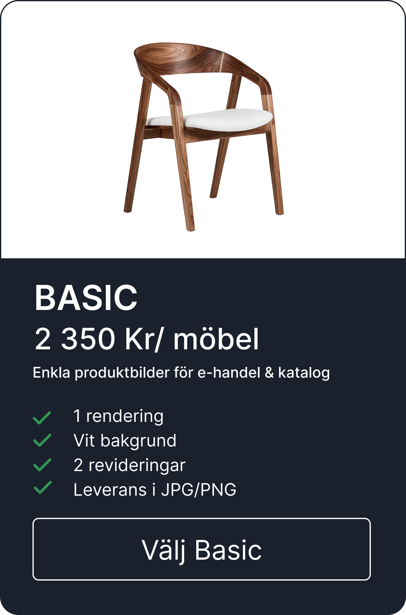 Vi tar era möbler från skiss, mått eller CAD-fil till fotorealistiska bilder – redo för e-handel, katalog och kampanj, så att ni kan lansera snabbare utan traditionella produktfoto.