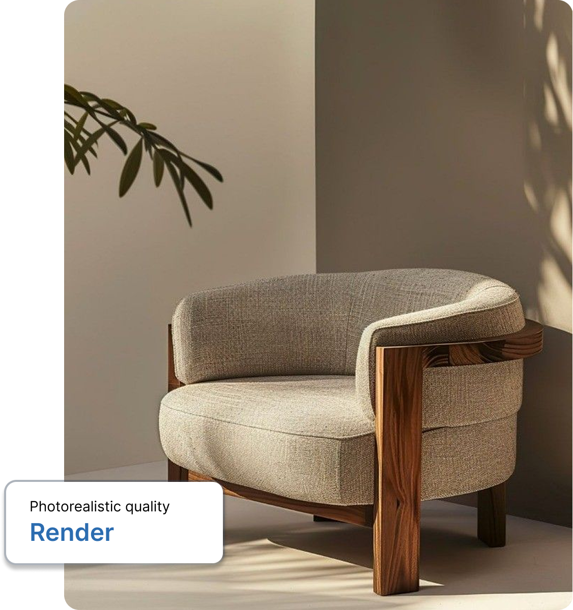 We take your furniture from sketch, measurements or CAD file to photorealistic images – ready for e-commerce, catalog and campaign, so you can launch faster without traditional product photos.