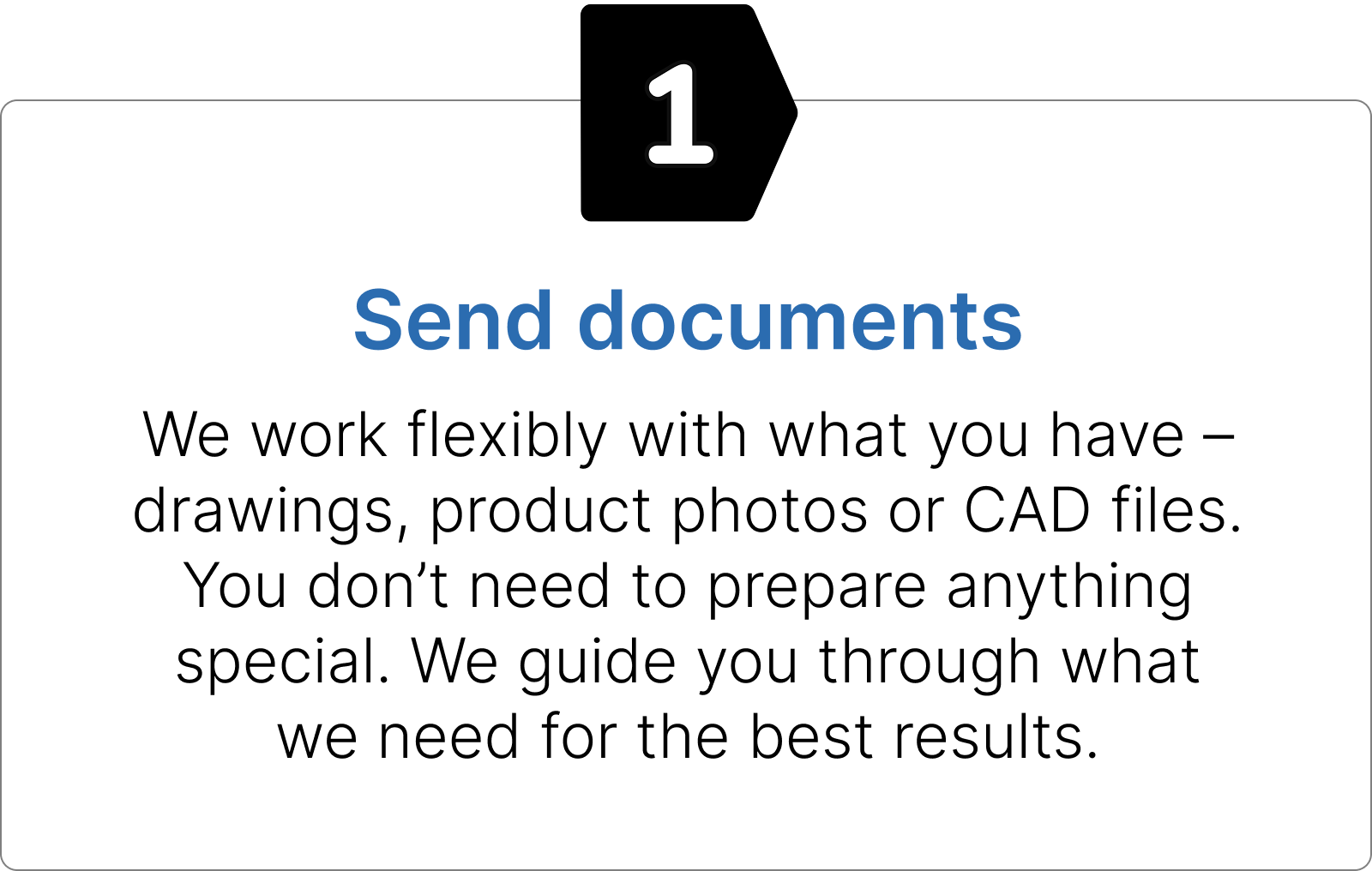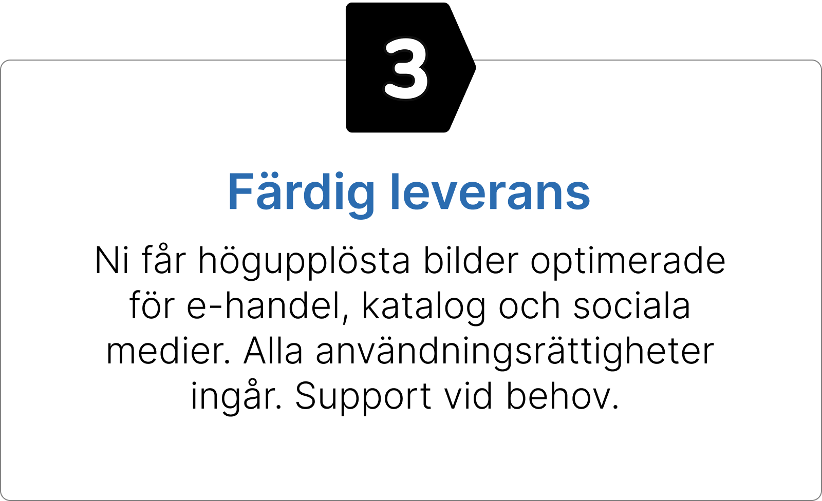 Vi hjälper er både när ni saknar 3D-underlag och när ni redan har modeller klara. Ni får färdiga, konsekventa produktbilder som går att återanvända i e-handel, katalog och kampanjer.