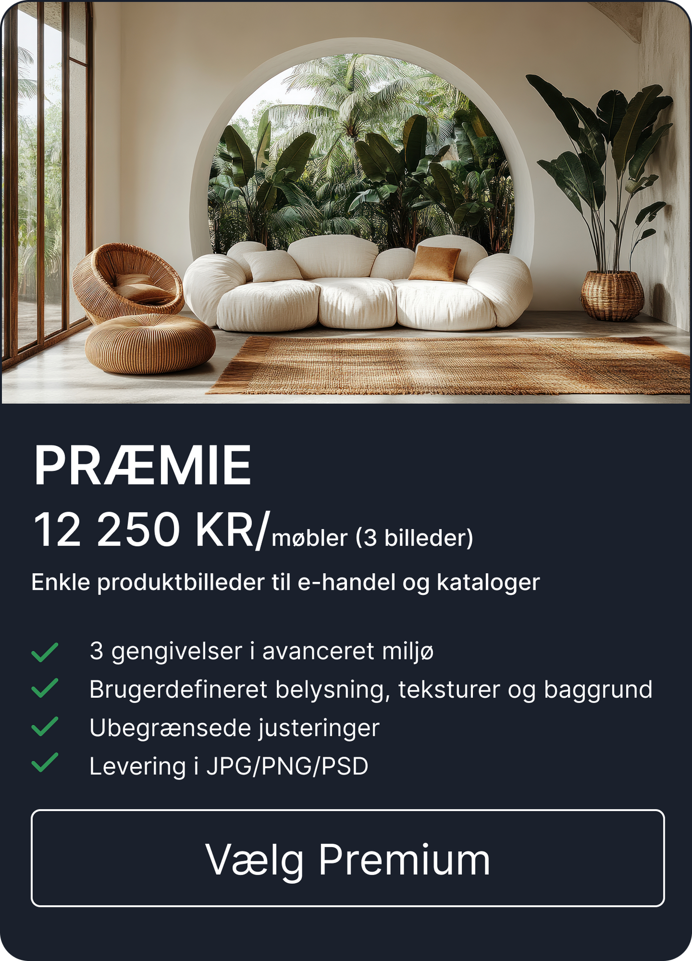 Vi tager dine møbler fra skitse, mål eller CAD-fil til fotorealistiske billeder – klar til e-handel, katalog og kampagne, så du kan lancere hurtigere uden traditionelle produktfotos.