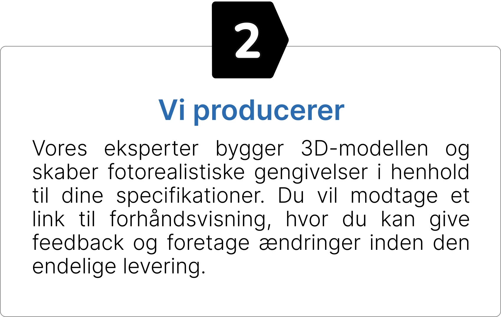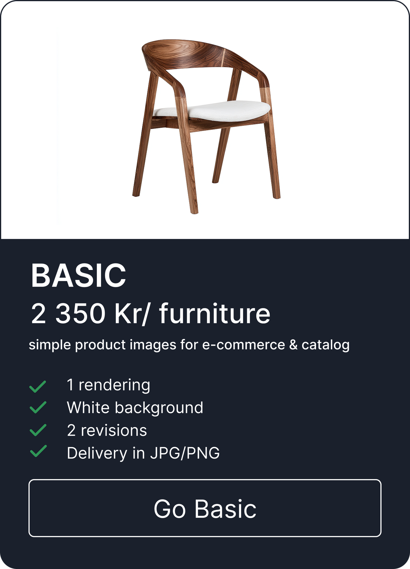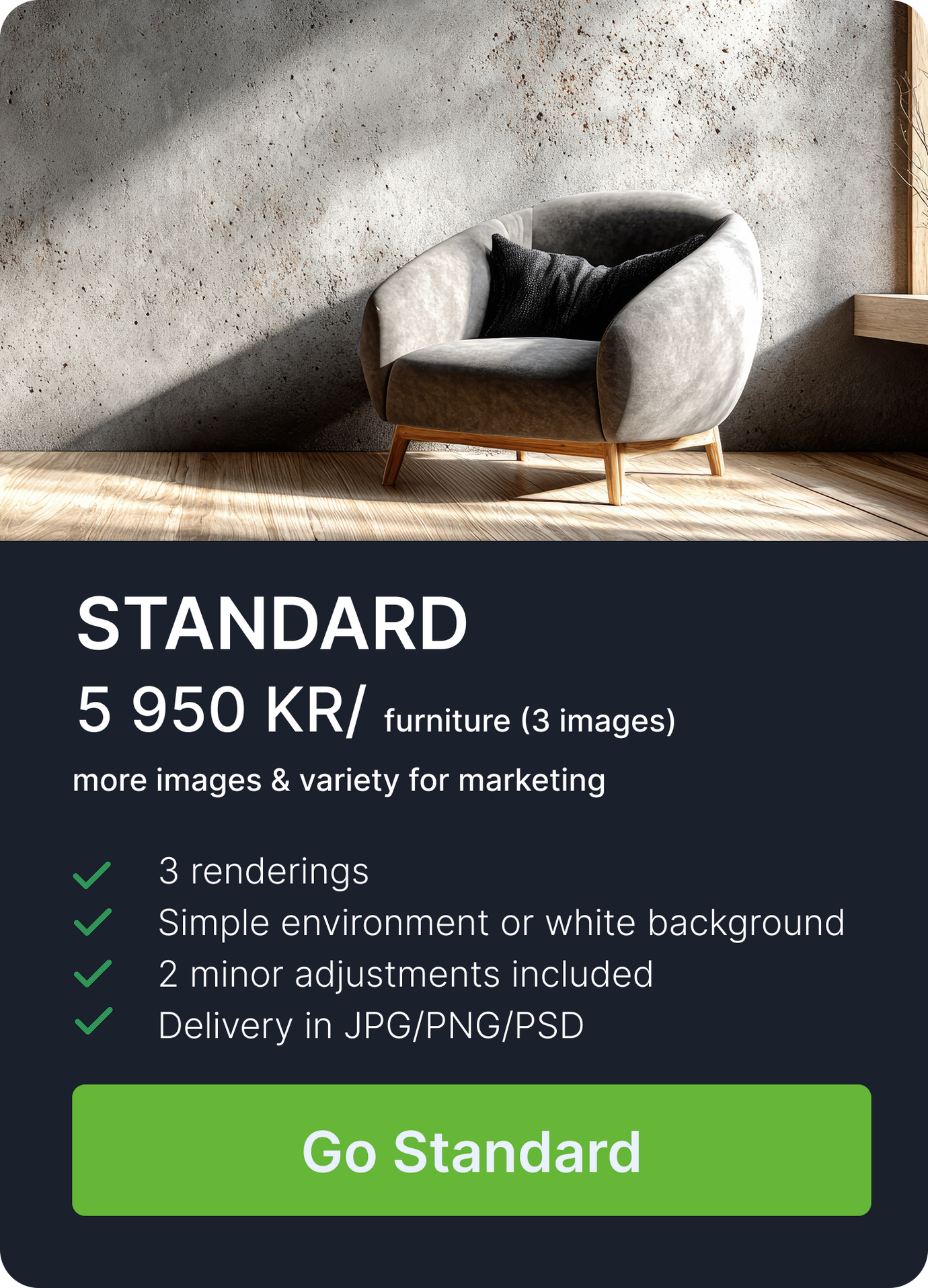 Vi tilbyder 3D-gengivelser i høj kvalitet, der fremhæver dine produkter på den bedste måde – uanset om du har brug for simple billeder til e-handel eller eksklusive præsentationer til markedsføring. Vælg den pakke, der passer til dine behov: