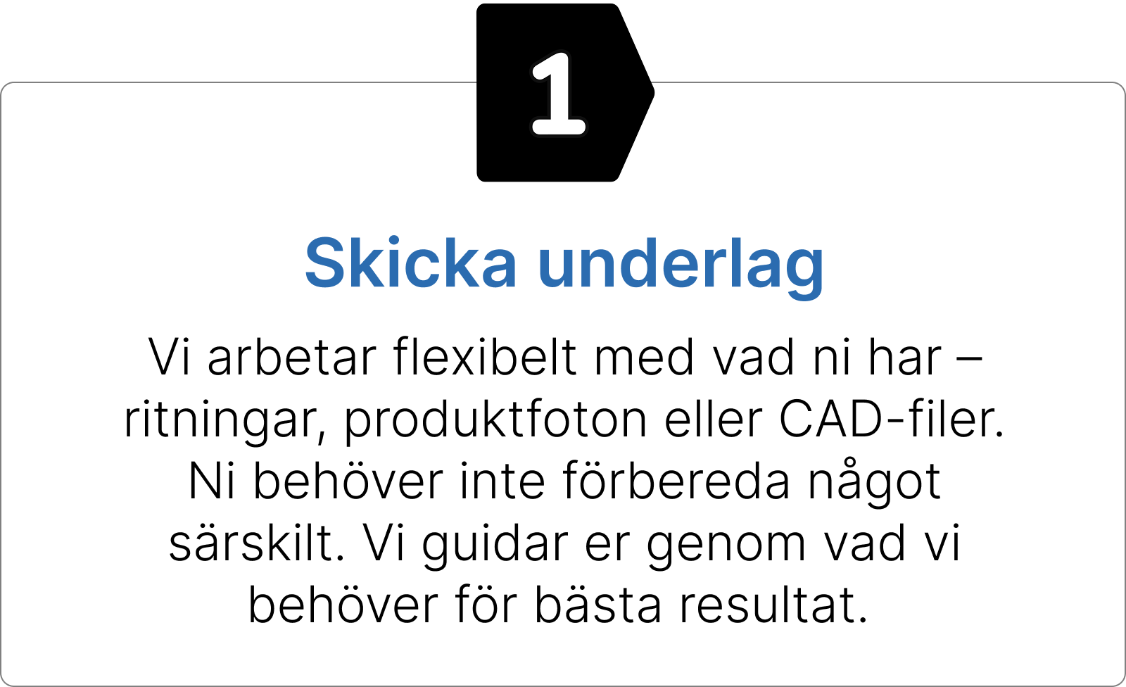 Vi hjälper er både när ni saknar 3D-underlag och när ni redan har modeller klara. Ni får färdiga, konsekventa produktbilder som går att återanvända i e-handel, katalog och kampanjer.