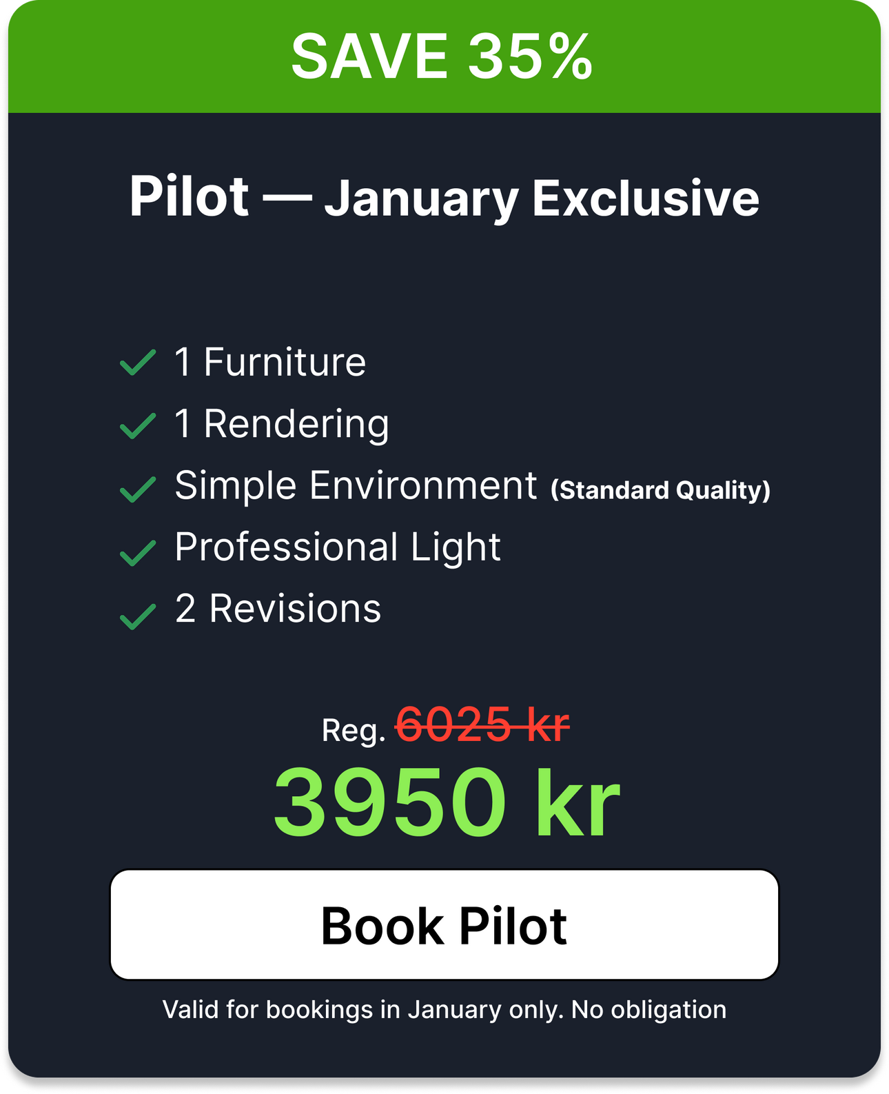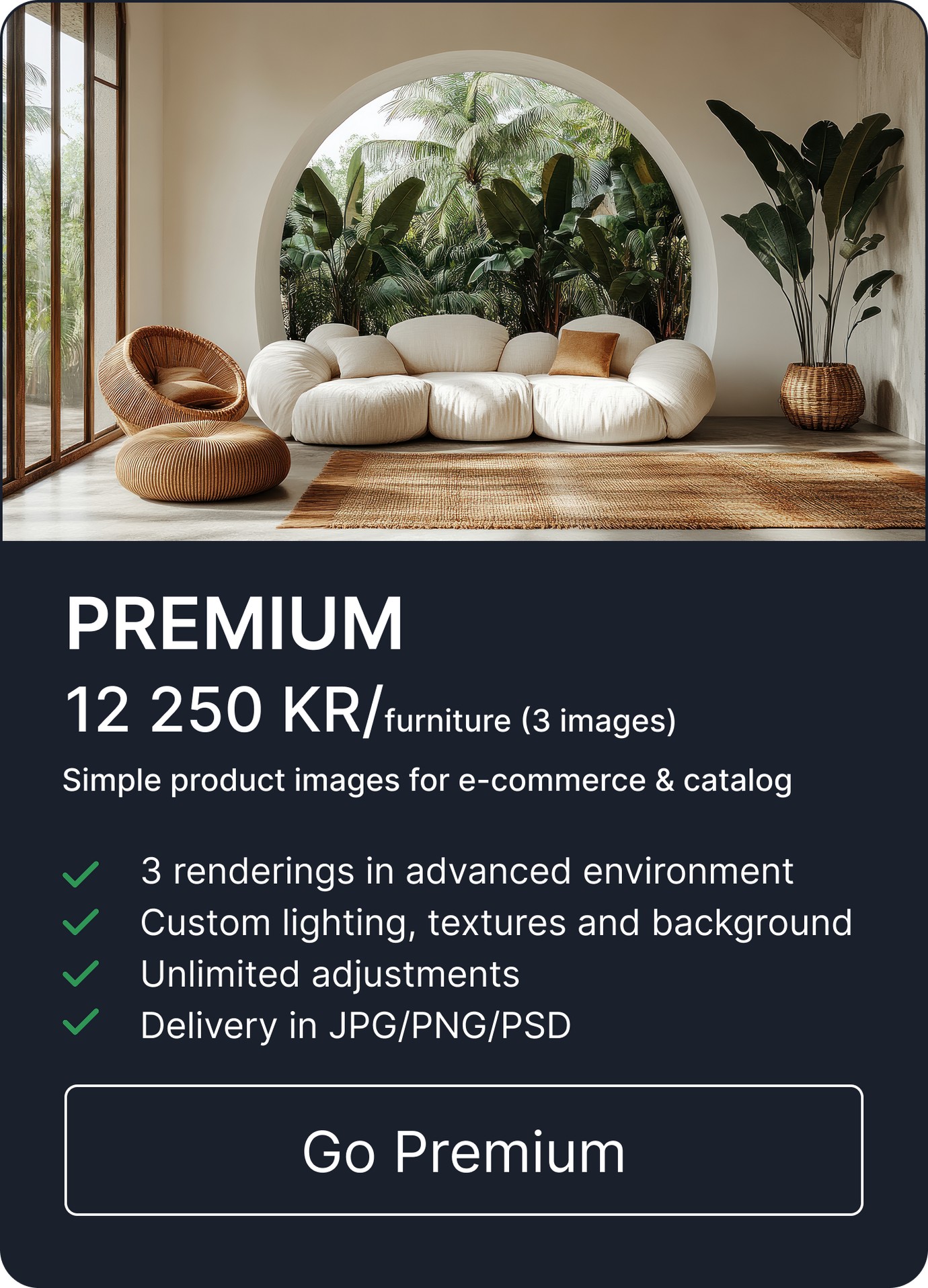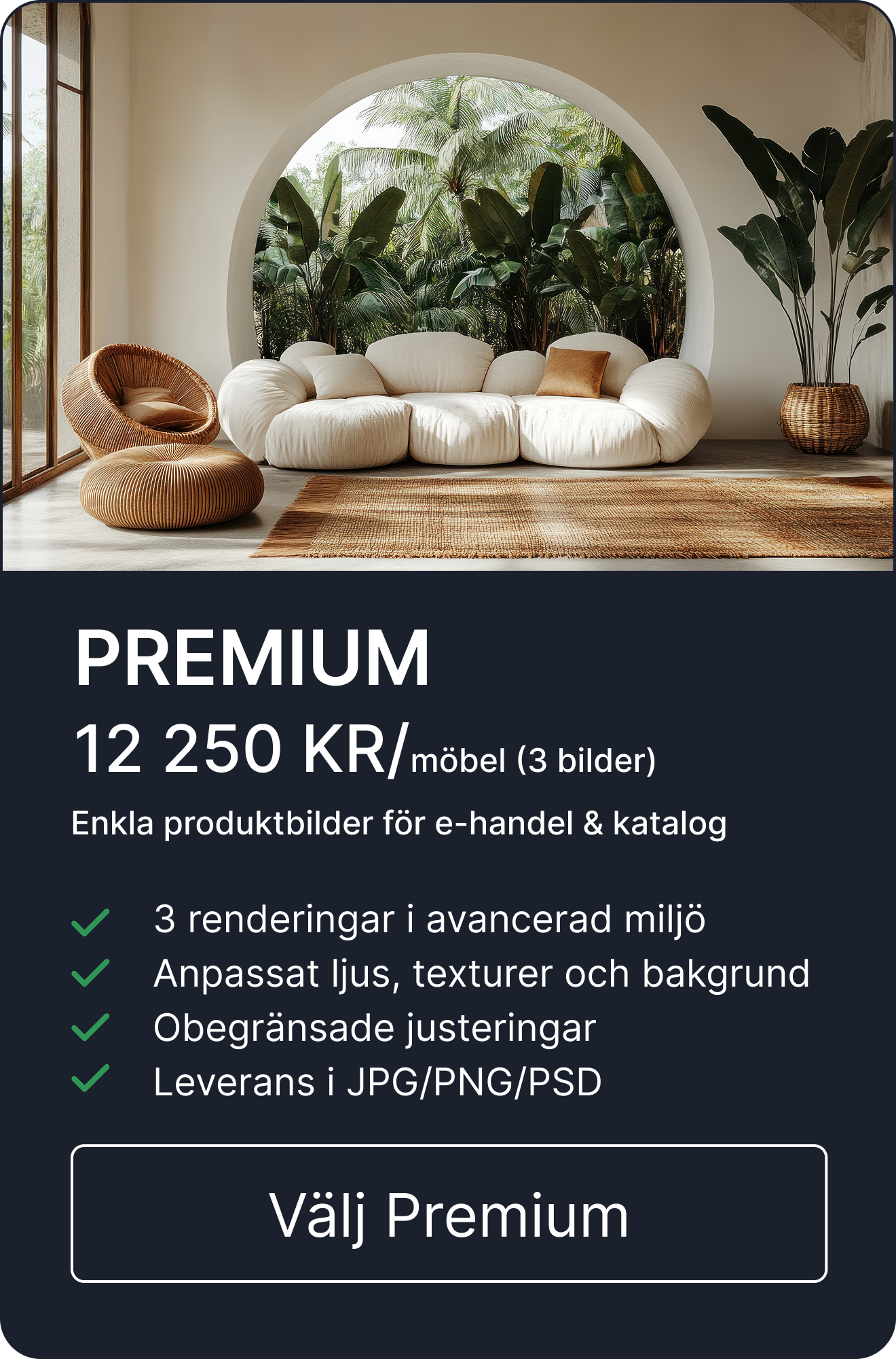 Vi tar era möbler från skiss, mått eller CAD-fil till fotorealistiska bilder – redo för e-handel, katalog och kampanj, så att ni kan lansera snabbare utan traditionella produktfoto.